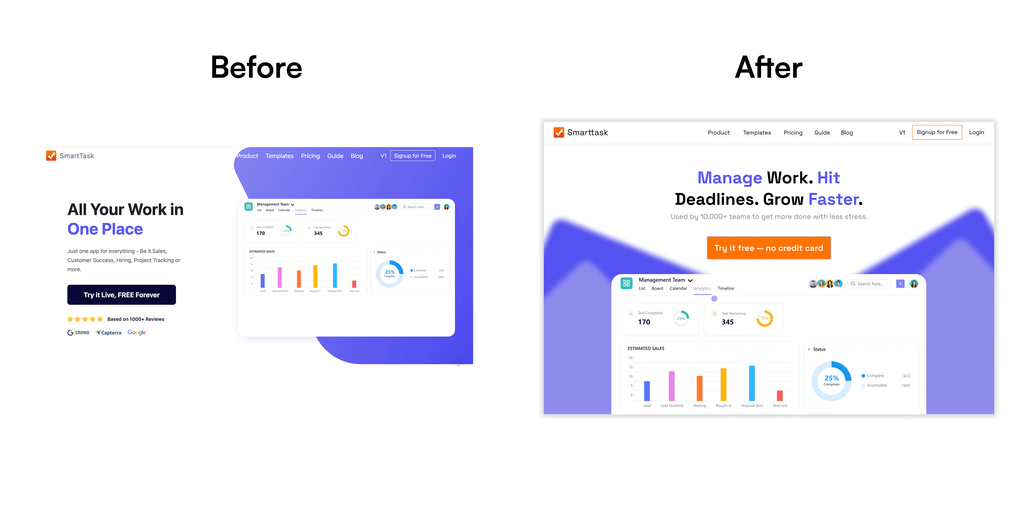 Smarttask is a project and task management platform used by thousands of teams to streamline workflows. While powerful under the hood, the original hero section lacked visual clarity and hierarchy.